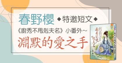 作者專欄 2023/05/24 春野櫻《廚秀不甩剋夫名番外【淵默的愛之手】 「是不是又痛了?」他的聲音聽起來沒有火氣,「躺好,我幫妳揉揉吧。」 瞬間,她的眼眶濕熱,心窩也暖呼呼的。 「淵默……」 「閉上眼睛,放鬆,試著睡覺。」他的聲音在幽靜的室內猶如暮鼓般低沉又震撼。