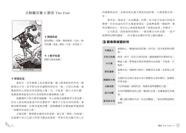 這不是一本占卜道具書,而是一面能真正看見自己的鏡子。 作者以愚者的旅程為軸,帶領讀者穿越 78 張牌,把塔羅從「預測工具」 重新還原成「理解自己」的語言。 在牌的故事裡,你會看到恐懼、孤獨、渴望與希望,也會理解每一張牌背 後,其實都藏著人生正在對你說的話。 本書以簡潔又深刻的敘事,重新整理大阿爾克納與小阿爾克納的象徵, 圖像拆解清晰、正逆位脈絡分明、愛情/事業/心靈的生活應用完整而實用。 不論是初學者,或已熟悉塔羅的讀者,都能以愚者的視角再次理解塔羅的核心精神。 在你失落、迷茫或渴望方向的時刻,這本書會以一句提醒、一個象徵,扶著你往前。 你以為迷失的地方,正是靈魂邀請你前進的門口。 這是一本能在低潮時扶你一把,在混亂時陪你一起呼吸的塔羅書。